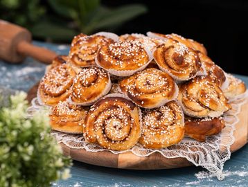 Traditional Swedish cinnamon buns are made with a perfectly soft and chewy cardamom dough and a buttery cinnamon-sugar filling. Minimum order of 4 pcs.