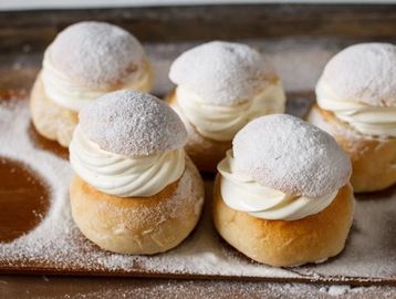 A small, wheat flour bun, flavoured with cardamom and filled with almond paste and whipped cream. A Swedish classic around this time of the year. Minimum order of 4 pcs.