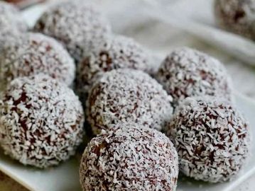 Chocolate Coffee Balls, a delicious non-baked mix of oats, butter, sugar, cocoa and coffee, rolled in coconut. Minimum order of 4 pcs.